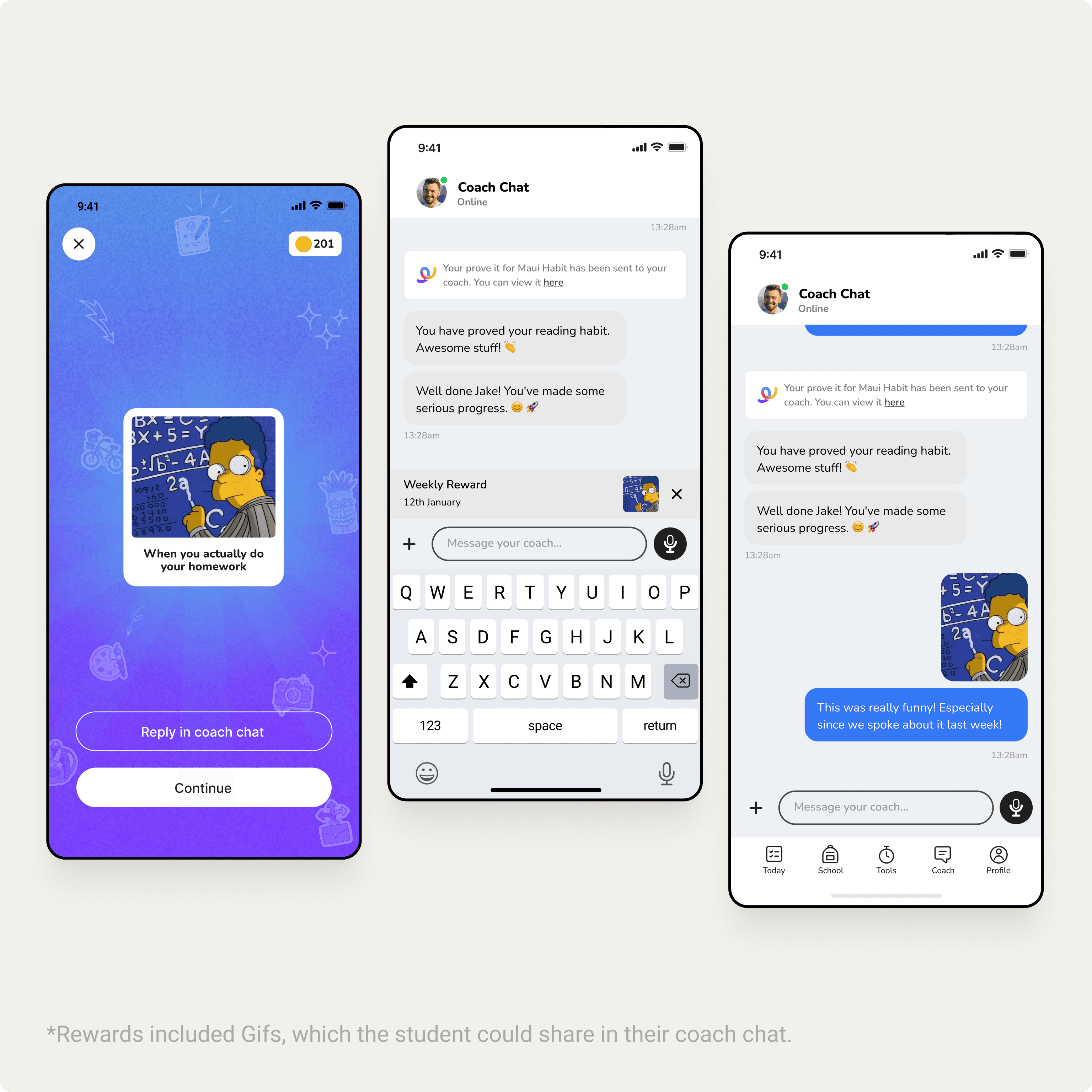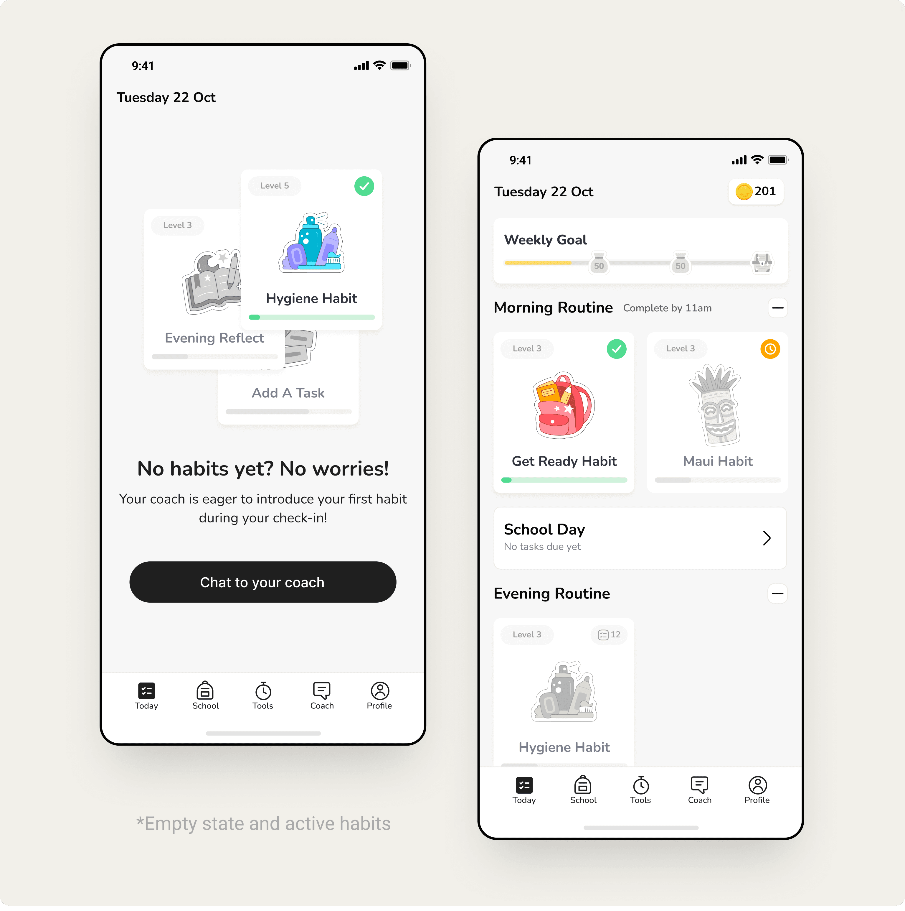 Morning and evening routines: We designed structured daily routines to help students build consistency around essential tasks. Light gamification reinforced completion and progress without distracting from the core behaviour.